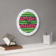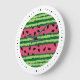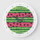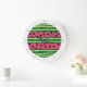 A clock with a cute watermelon pattern. Green rind in layers of stripes along with a layer of pink stripes with black seeds inside.