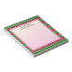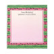 A notepad with a cute watermelon pattern. Green rind in layers of stripes along with a layer of pink stripes with black seeds inside.