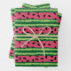 Wrapping paper sheets with a cute watermelon pattern. Green rind in layers of stripes along with a layer of pink stripes with black seeds inside.