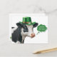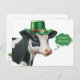 St. Patrick's Day postcard featuring a cute, festive watercolor illustration of a black and white cow ready for a St. Patrick's Day celebration weaing a green top hat with a gold band, white daisy and green shamrock. Text "Where the Craic?" in a green thought bubble (craic translation = good time). A watercolor shamrock in lower left corner on the reverse.