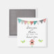 Cute Whimsical Birds And Birdhouse Wedding Favour Thank You Magnets. A lovely way to say thanks! Multi-colour bunting at the top with sweet green birds flying towards a birdhouse with a heart shaped entrance. Clean, simple design, great for Boho and Shabby Chic lovers! Easily customisable for you to add your own details.