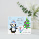 Cute Whimsical Christmas Penguin and Bird eating bird seed with Christmas tree and snowflakes in the background personalised postcard Christmas card,