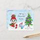 Cute Whimsical Christmas snowman red and green winter hate and mittens and Bird eating bird seed with Christmas tree and snowflakes in the background personalised postcard Christmas card,