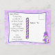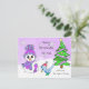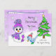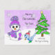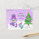 Cute Whimsical Christmas snowman purple and blue winter hat and mittens and Bird eating bird seed with Christmas tree and snowflakes in the background personalised postcard Christmas card,