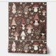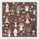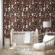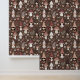 A cottage core folk art style wall paper with cute little fairy gnomes, mushrooms, flowers in mauve, brown and burgundy.
