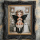 This whimsical fairy scene is sure to cast a smile! Featuring a wide-eyed fairy in bat wings sitting on a toilet, surrounded by shy little ghosts and vintage floral wallpaper, it's the perfect mix of sweet and strange. With her curly hair crowned in black roses and those oversized boots, she's ready for a spooky season bathroom break!