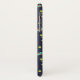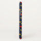 A phone case with a pattern of hand-drawn whimsical birds. Cute little green pine trees between them. Dark blue background.