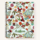 Customisable name and monogram notebook with cute whimsical painted ladybugs, plants, flowers, and red mushrooms with faux glitter effect.