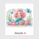 “Explore this enchanting whimsical cartoon of a delightful mermaid sitting on a vibrant coral-covered rock, surrounded by friendly fish,. The mermaid has long flowing pink hair, and a vibrant blue green tail. She has two blue and one pink fish swimming close by and a happy pink starfish resting among the colourful seaweed and coral. This adorable illustration will charm children and adults alike.