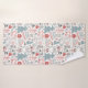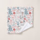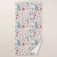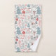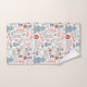 This cute Christmas bath towel set features a fun whimsical pattern of Santa illustrations, trees, and presents in pink, red, and teal.