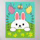 Cute white cartoon bunny rabbit with big pink ears and and adorable face is poking out of his rabbit hole. He is surrounded by green grass and pretty flowers. Above the bunny's head is a pretty butterfly fluttering around.
