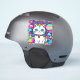 Cute, whimsical, white cartoon kitty cat with big blue eyes, pink ears and wearing a bright colourful collar. She has a cute blue, pink and white striped tail and a blue stripe on her head. The background is mostly purple with planets, clouds, stars and flowers in a mix of bold, bright, vibrant colours. Ideal for anyone who loves cats and space.