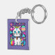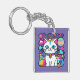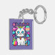 Adorable key chain featuring a cute, whimsical, white cartoon kitty cat with big blue eyes, pink ears and wearing a bright colourful collar. She has a cute blue, pink and white striped tail and a blue stripe on her head. The background is mostly purple with planets, clouds, stars and flowers in a mix of bold, bright, vibrant colours. Ideal for anyone who loves cats and space.