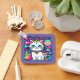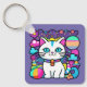 Adorable key chain featuring a cute, whimsical, white cartoon kitty cat with big blue eyes, pink ears and wearing a bright colourful collar. She has a cute blue, pink and white striped tail and a blue stripe on her head. The background is mostly purple with planets, clouds, stars and flowers in a mix of bold, bright, vibrant colours. Ideal for anyone who loves cats and space.