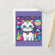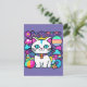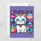 Adorable postcard featuring a cute, whimsical, white cartoon kitty cat with big blue eyes, pink ears and wearing a bright colourful collar. She has a cute blue, pink and white striped tail and a blue stripe on her head. The background is mostly purple with planets, clouds, stars and flowers in a mix of bold, bright, vibrant colours. Ideal for anyone who loves cats and space.