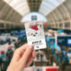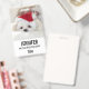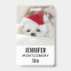 A name tag with an adorable photo of a cute white doggy wearing a red christmas hat.