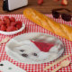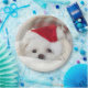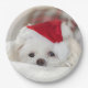 Paper plates with an adorable photo of a cute white doggy wearing a red christmas hat.