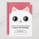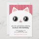 Birthday invitation for kids featuring a cute white kitten face with big round shiny eyes. The background is striped. Easy to customise as it is designed as a template.