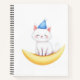 An adorable white kitten sitting on a crescent moon wearing a tiny blue sleeping hat. A sweet and dreamy design perfect for cat lovers and kawaii fans.
