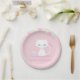A paper plate with a cute white kitty cat that has a pink bow tied on her tail and a collar that has a paw print icon. Besides the kitten is a little cake with a candle and fish decoration on top. hanging from the top are colourful bunting flags for a touch of party atmosphere. Pastel colour palette of pink, blue, yellow and white. Add your birthday message to make it perfect for a cat themed birthday party.