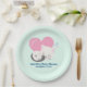 Baby shower paper plates with an adorable graphic illustration. A white kitty cat with a cute paw print image on her fur. Sleeping peacefully. A big pink heart behind her and some little stars too. Mint green background.
