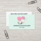 A business card with an adorable graphic illustration. A white kitty cat with a cute paw print image on her fur. Sleeping peacefully. A big pink heart behind her and some little stars too. Mint green background.