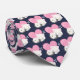 A tie with an adorable graphic illustration. A white kitty cat with a cute paw print image on her fur. Sleeping peacefully. A big pink heart behind her and some little stars too. Dark blue background.