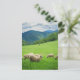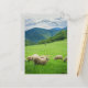 Cute white sheep and picturesque mountains holiday postcard