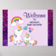 Welcome baby shower poster. Designed with a white mama unicorn with fancy colourful mane and tail. A baby unicorn laying down beside her, with a green pacifier in its mouth. A colourful rainbow with fluffy clouds, and some stars and heart decorate this sweet and adorable design. A bold pink outline surrounding the image gives it a child-like doodle vibe. Light purple-pink pastel coloured background. The left and ride side borders have a purple-pink faux-glitter image.