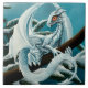 A beautiful small white winter dragon with shimmering scales and bright glowing eyes perches gracefully on a snow-covered pine branch. Surrounded by frosty evergreen needles and a cool winter sky, this enchanting fantasy painting captures the magical spirit of a dragon in a peaceful snowy forest. Perfect for dragon lovers, fantasy art fans, and anyone who enjoys mystical winter scenes.