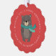 Send festive holiday greetings with an adorable Christmas keepsake your friends and family will treasure for years to come. This paper ornament card features a cute cartoon bear bundled up in a cosy winter scarf, set against a festive red background. Personalise the front with your custom greeting and family name in bright white lettering that borders the design. The back of the bear ornament card displays your favourite family photo, making it a sweet and memorable way to share holiday cheer with loved ones.