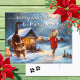 A delightful Catmas and Mew Year holiday postcard featuring a winter scene with a lazy cat and cute girl in a red Christmas dress. The gifts are waiting behind the cabin.