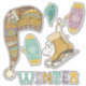 Cute illustrated winter design with ice skates and a long knit stocking cap with pom. Says winter in a colourful whimsical font. In colours of teal, gold, purple and white. A cute winter season collage design.