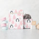 A Cute minimal penguin and Christmas tree design in pink . A lovely girly festive holiday gift wrap.