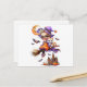 A cute little witch flies on her broom with a fluffy kitten in a tiny cape. Below are pumpkin houses, and in the sky a smiling moon and tiny bats wearing glasses. The artwork is in a vibrant kawaii cartoon style with lots of fun details to explore.