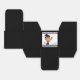 Tiny favour box 2 inch x 2 inch, with a cute witch wearing a big purple witches hat. Her black cat resting on top her head. She has long orange hair and is carrying a broom. Cute cartoon illustration perfect for halloween. Black and white stripes along the top and bottom.
