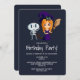 A birthday party invitation with a cute witch wearing a big purple witches hat. Her black cat resting on top of her head, adorable! She has long orange hair and is carrying a broom. A friendly looking white skeleton beside her. Cute cartoon illustration perfect for halloween.