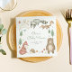 Gender Neutral baby shower napkins with hand-illustrated woodland forest scene with trees, flowers, mushrooms, bear, bunny, racoon, squirrel, bird, fox, and hedgehog.