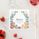 These woodland animal baby shower napkins are decorated with cute watercolor forest friends and greenery. A fox, racoon, hedgehog, bunny, and squirrel are surrounded by rustic eucalyptus greenery. Easily customisable. Original Watercolor © Michele Davies.