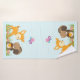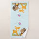 Bath towels with a cute illustration featuring a baby deer and a little squirrel holding an acorn and a butterfly flying above their heads. These adorable woodland creatures on standing on some grass with some whimsical mushrooms by their feet.   Light blue background.