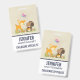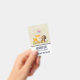 Name badge with a cute illustration featuring a baby deer and a little squirrel holding an acorn and a butterfly flying above their heads. These adorable woodland creatures on standing on some grass with some whimsical mushrooms by their feet. Soft brown background.