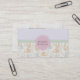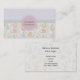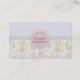 Business card template with the bottom half decorated in a fun pattern illustrated with adorable foxes, cute little birds and whimsical green trees. The top half has a lavender purple background with a linen style texture. The centre has a pastel green banner. A pink circle holds your business name. I think this quaint children's / nursery style pattern is really cute and reflects a happy child-like innocence.
