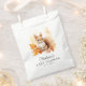 Cute, woodland-themed baby shower favour bags featuring a watercolor illustration of a baby squirrel surrounded by fall leaves in shades of orange, red, and yellow. Personalise the baby squirrel baby shower favour bags with the mother-to-be's name and date of baby shower. Designed to coordinate with our Cute Woodland Animals Fall Baby Shower collection.