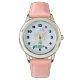 A watch with a cute smiling dinosaur, pink rosy cheeks and RAWR written on his belly. 3 colourful happy stars above his head.