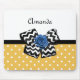 Add a girly vibe to your office style with this cute yellow and white polka dot pattern mousepad with a trendy black and white chevron bow and a chic blue ribbon rose. Make this yellow and blue retro meets modern design personalised by adding the name of your teen girl. Flat printed image, NOT actual rosette ribbon and bow.