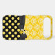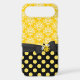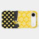 Stylish iPhone 6 Plus case, with a yellow and white damask pattern, on the top of the case and a yellow on black polka dot pattern, on the bottom. Graphics of a black ribbon and bow runs across the case between the two backgrounds and is decorated with graphics of a yellow and black ladybug. Pretty way to protect your iPhone 6 and look stylish too, and makes a great gift idea.