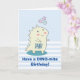 Set on a light blue and white pattern of polka dots on top and stripes on the bottom. Amuzing text says: Have a dino-mite birthday. Personalised message inside.