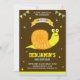 Invite your guests with this cute birthday party invitation featuring an adorable little snail with vibrant elements against a dark brown background. Simply add your event details on this easy-to-use template to make it a one-of-a-kind invitation. Flip the card over to reveal a orange and white stripes pattern on the back of the card.