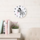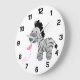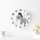 This cute clock for a baby nursery features an image of a darling grey zebra with black stripes. The little guy is fascinated with a pink butterfly that is flying just beneath his nose. Black numbers around the perimeter make the clock easy to read. The images and text are placed on a white background. Adorable for your baby, or as a gift for the nursery room.