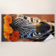 Cute black and white zebra wearing a halo of orange flowers in her hair.